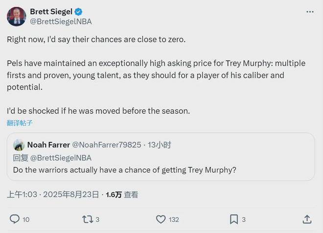 美記:勇士和馬刺有意特雷·墨菲三世,但鵜鶘拒絕一切報價